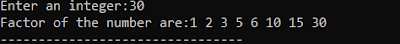 #include<stdio.h> void main(){ int n,i; printf("Enter an integer:"); scanf("%d",&n); printf("Factor of the number are:",n); for(i=1;i<=n;++i) { if(n%i==0) printf("%d ",i); } }
